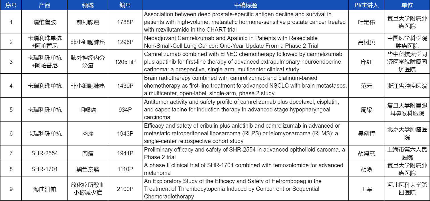在非小细胞肺癌、咽喉癌、肉瘤、前列腺癌、黑色素瘤等多个领域,卡瑞利珠单抗、阿帕替尼、瑞维鲁胺、SHR-1701、SHR2554等创新产品相关研究一共入选了8项壁报展示。此外,AG百家乐医药自主研发的血小板生成素受体激动剂(TPO-RA)海曲泊帕在放化疗所致血小板减少领域的探索性研究显示良好的疗效,入选壁报展示。